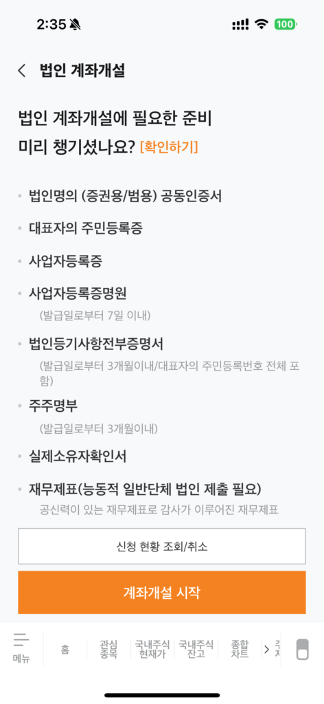 그러면 첫화면에 법인 계좌개설에 필요한 준비서류를 안내합니다.