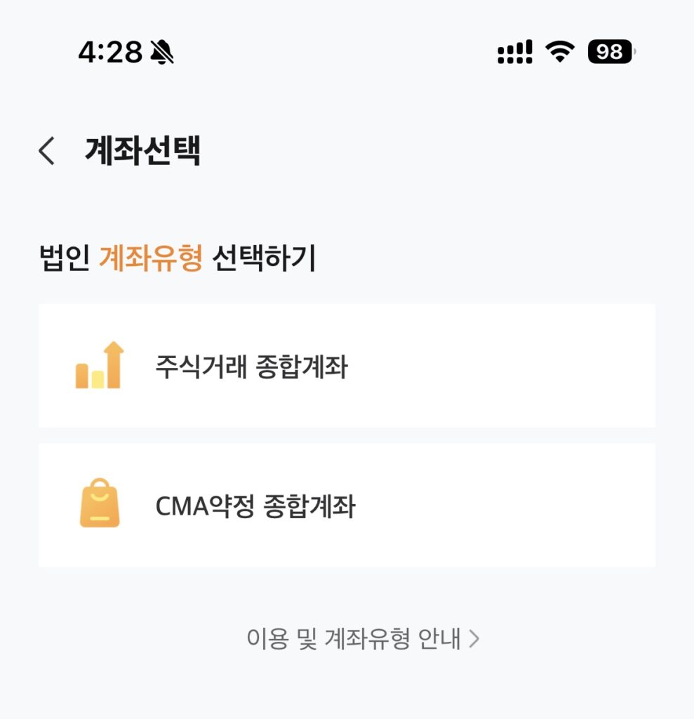 먼저 법인 계좌유형을 선택해야합니다. 저는 주식거래를 할 예정이므로 주식거래 종합계좌로 선택했습니다. cma계좌가 필요하시면 그것을 선택하시면 되겠죠.