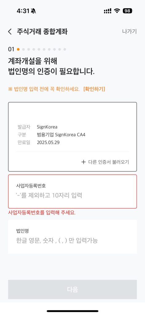 선택을 하면 법인 인증서와 사업자번호, 회사명을 입력하고 인증해야합니다. 즉, 인증서가 모바일 환경에 설치되어야 하므로 인증서를 발급받았다면 인증서를 pc에서 모바일로 복사 및 내보내기 작업을 해야합니다. 이건 별도로 검색해보시면 워낙 방법이 잘 나와있으니 하실 수 있을것입니다. 법인명은 타사계좌인증에서 확인하는 법인명과 일치해야하니 인증할 계좌의 법인명과 동일하게 입력해야합니다. 보통 실제 법인명하고 같지 않을까 싶습니다.