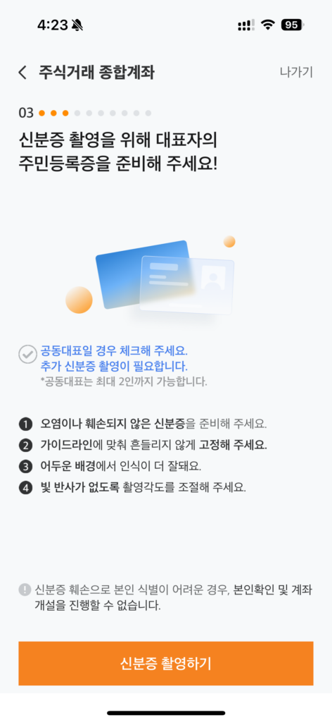 다음으로는 약관 동의 및 기업대표의 신분증 인증입니다.