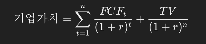 FCF: Free Cash Flow – 실제 기업이 사용할 수 있는 현금으로 회사가 운영 활동을 통해 생성한 현금 흐름에서 자본 지출(CapEx)을 차감한 것입니다. 이는 기업이 자산을 유지하고 확장하는 데 필요한 비용을 충당한 후 남는 순현금 흐름을 나타냅니다.r: 할인율 – 주로 WACC(가중평균자본비용) 사용TV: Terminal Value – 영구성장 또는 Exit Multiple 방식 활용